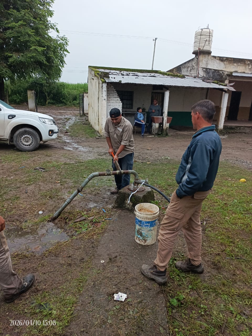En materia de infraestructura, se destaca la reparación en la salida de pozo de la Escuela Las Mercedes, en Santa Rosa de Leales, una acción fundamental para sostener el abastecimiento en la zona.